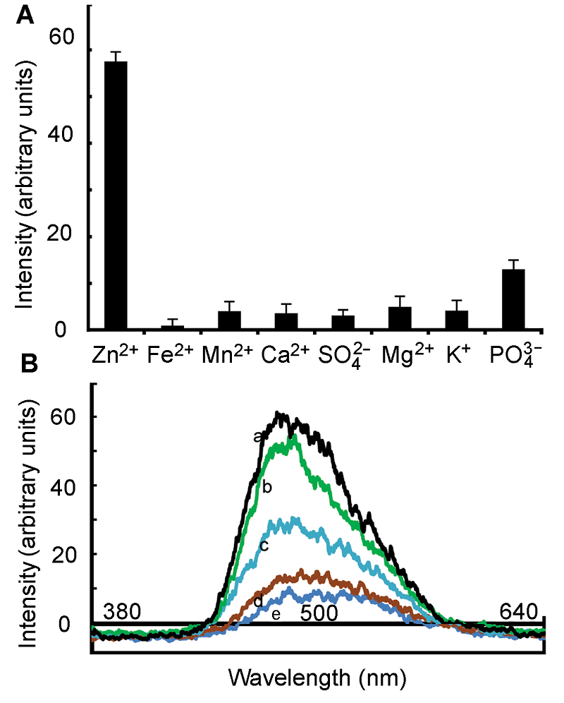 图2 HL1的特异性及对Zn2+结合的敏感性(A) 1 mmol·L-1不同元素与HL1探针结合后在500 nm处的荧光强度; (B) 不同Zn2+浓度下的荧光强度(a: 1 mmol∙L-1 Zn2+; b: 0.5 mmol∙L-1 Zn2+; c: 0.1 mmol∙L-1 Zn2+; d: 0.05 mmol∙L-1 Zn2+; e: 0.01 mmol∙L-1 Zn2+)