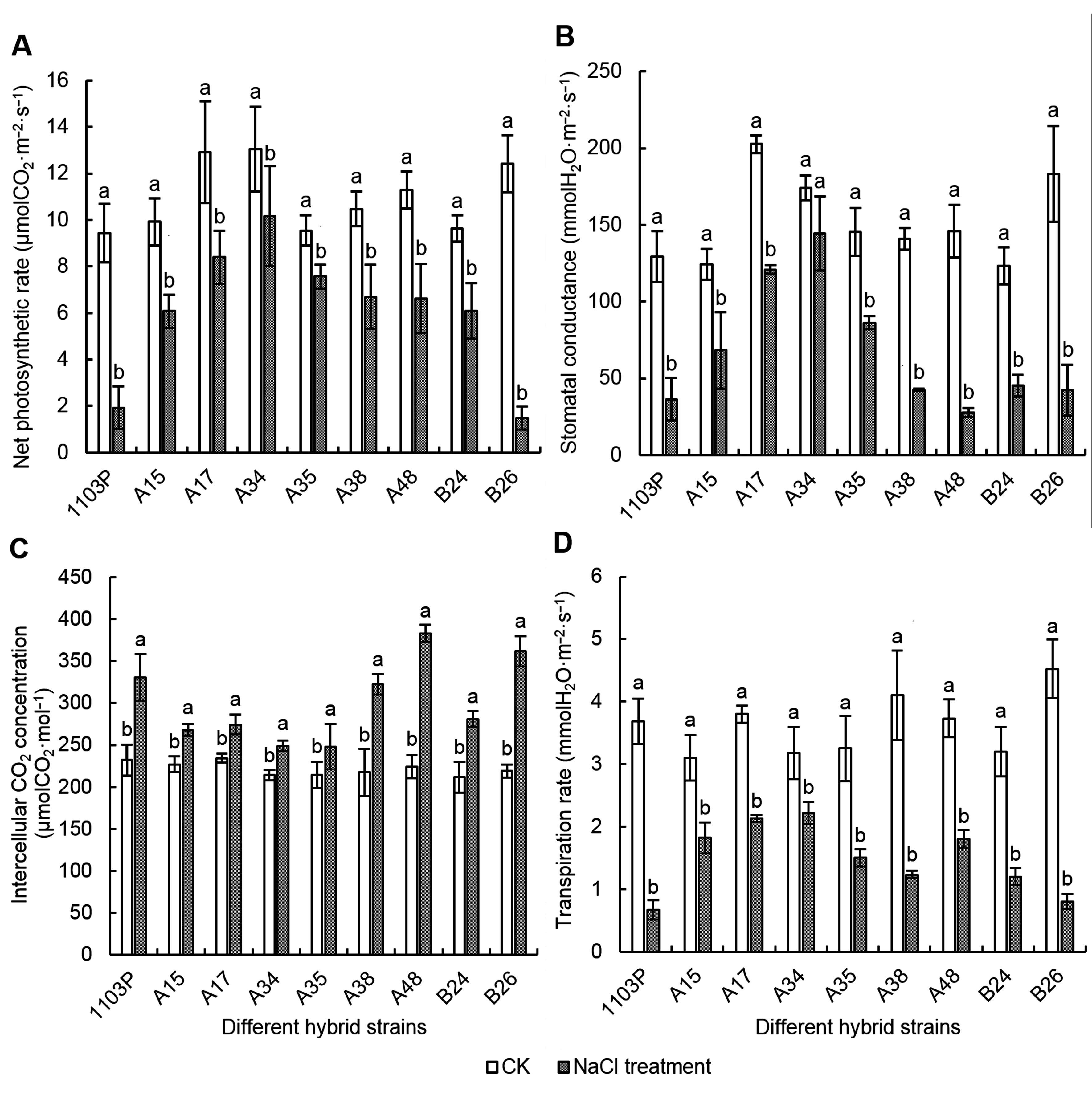Figure 3 Effects of NaCl stress on Pn, Gs, Ci and Tr of different grape hybrid strainsPn: Net photosynthetic rate; Gs: Stomatal conductance; Ci: Intercellular CO2 concentration; Tr: Transpiration rate. Different lowercase letters indicate significant differences under different treatments of the same strain (P<0.05).