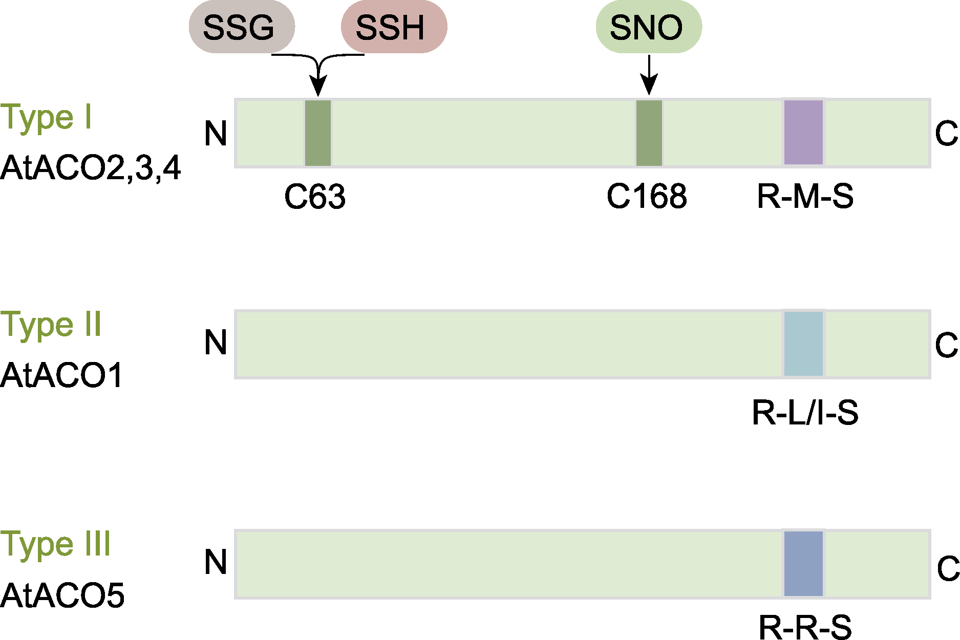 Figure 7 The structure of three types of ACO proteins in Arabidopsis thaliana (refer to Pattyn et al., 2021) Post-translational modifications at C63 include S-glutathionylation (SSG) and S-sulfhydration (SSH), while modifications at C168 involve S-nitrosylation (SNO). ACO is the same as shown in Figure 5.