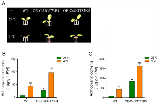 摘要: 近年来, UGTs基因在植物响应非生物胁迫中的作用逐渐被揭示。基于转录组数据, 筛选出两个在低温胁迫下显著上调, 且与茶树(Camellia sinensis)花青苷合成相关的糖基转移酶基因CsUGT73B4(CSS0039619)和CsUGT85K5(CSS0047548)。为探究两个基因在响应低温胁迫下调控茶树花青苷代谢的分子机制, 我们克隆了CsUGT73B4和CsUGT85K5并进行了生物信息学分析, 通过拟南芥过表达和茶树瞬时沉默实验验证其功能。结果显示: 低温胁迫下CsUGT73B4/CsUGT85K5基因的表达与花青苷积累呈正相关; 过表达拟南芥中, 花青苷含量、抗氧化酶活性(SOD、POD、CAT)显著提高, 而丙二醛和相对电导率显著下降; 在茶树中瞬时沉默CsUGT73B4或CsUGT85K5后, 花青苷含量及其合成相关基因的表达水平均显著下调。本研究初步探讨了茶树CsUGT73B4和CsUGT85K5基因的功能, 揭示了其通过调控花青苷代谢提高茶树抗寒性的分子机制, 为茶树抗寒分子育种提供了相关候选基因。