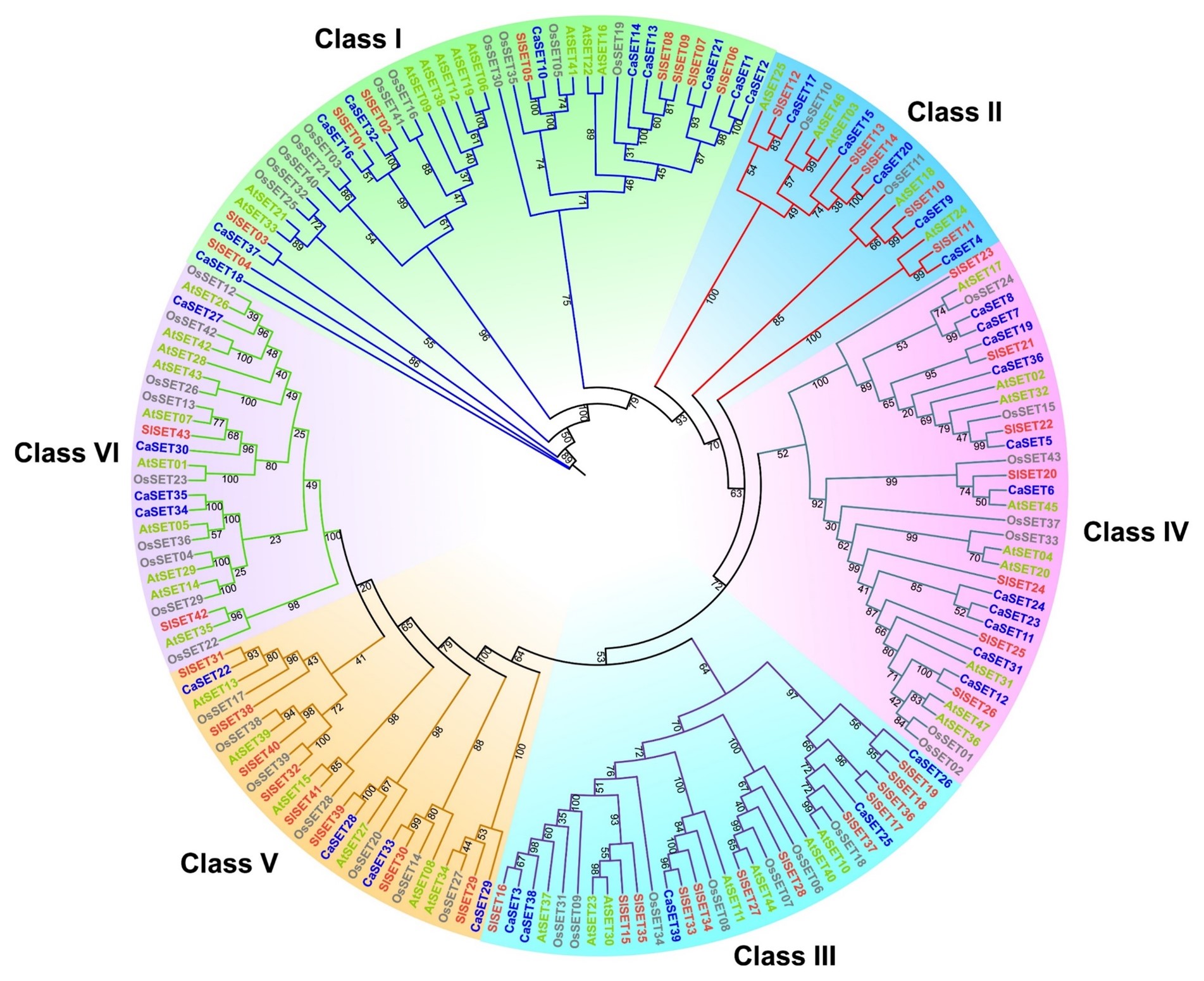 摘要: 含有保守Su(var)3-9, Enhancer-of-zeste和Trithorax (SET)结构域的蛋白能够催化组蛋白赖氨酸甲基化, 从而调控染色质结构和相关基因的转录, 参与植物多种生理与发育过程。辣椒作为全球重要的蔬菜作物, 其非生物胁迫抗性机制的研究对分子育种具有重要实践意义, 但目前辣椒SET基因家族在胁迫响应中的作用尚不明确。本研究在辣椒基因组中鉴定了39个CaSET基因, 根据保守结构域和系统发育关系可将其划分为六个亚家族(I–VI)。这些基因分布于除第5和9号染色体外的其余10条染色体上, 其中第3号染色体分布最为密集(8个)。大多数CaSETs (89.7%)可能定位于细胞核或细胞质。各分支的CaSETs具有特定的保守结构域, 与系统进化分类结果一致。基因家族扩张分析显示, 串联重复和片段复制事件是CaSET基因扩张的主要驱动力。在CaSET基因启动子中总共鉴定出403个与植物激素及胁迫响应相关的顺式作用元件。CaSET基因在辣椒不同组织中表达存在差异, 多数成员在发育早期果实中的表达水平高于其他组织。多个CaSET基因的表达受盐胁迫和干旱胁迫调控, 且在叶片中的响应比根系更为敏感, 暗示CaSET基因可能参与辣椒对盐和干旱胁迫的应答过程。未来研究将着重阐明关键CaSETs在转录调控和功能蛋白修饰中的作用。总之, 本研究对辣椒CaSET家族进行了全面分析, 为深入揭示其在非生物胁迫耐受性中的分子机制提供了理论基础。