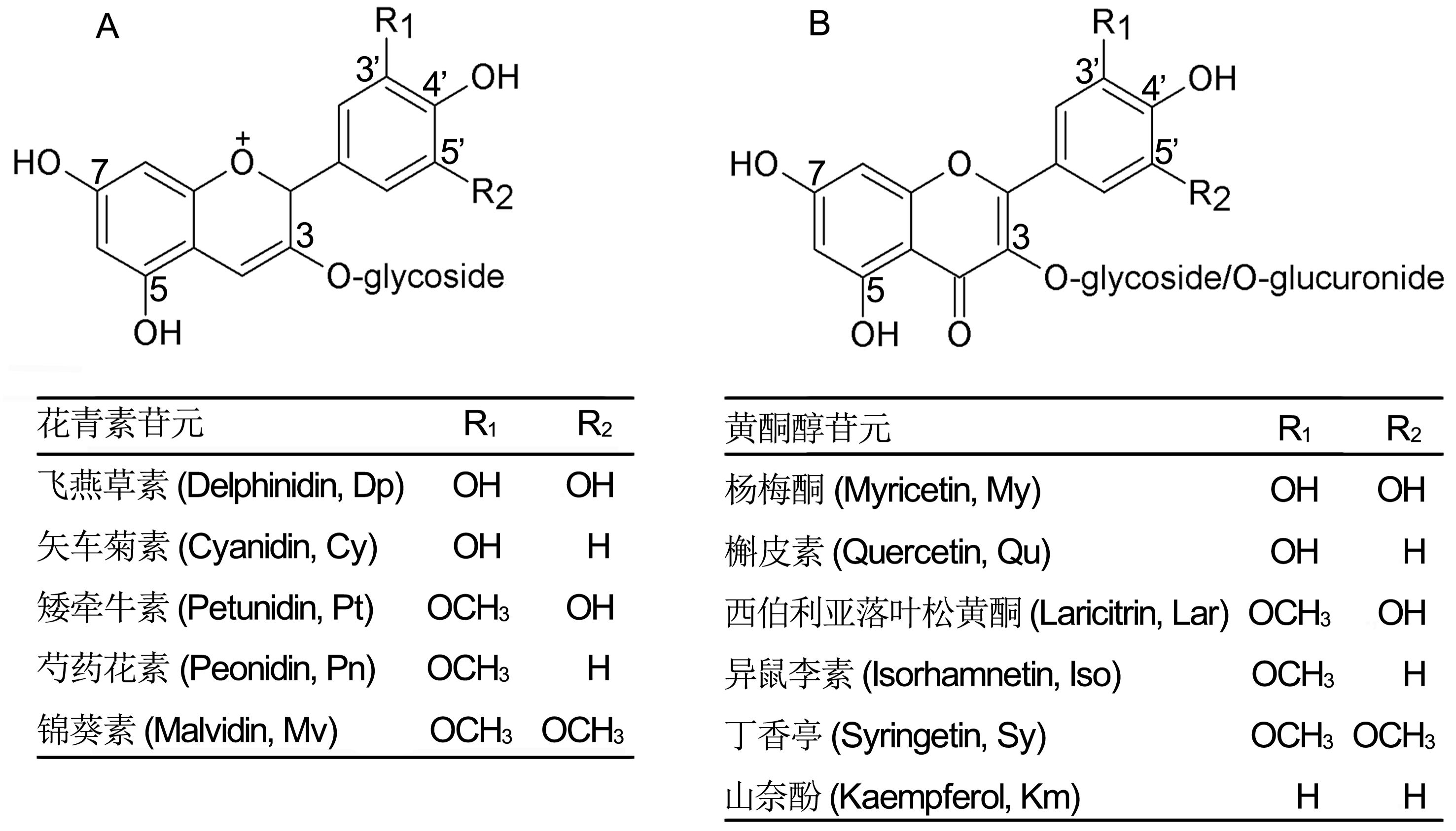 图1 笃斯越桔中花青苷(A)和黄酮醇苷(B)的结构