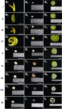 第VI、VII、VIII和IX期种仁接种30天后的生长状况。Bars=2 cm