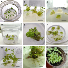 为建立野生大花银莲花(Anemone silvestris)组培再生体系, 分别以无菌苗上、下胚轴、叶片和叶柄为外植体, 探讨不同浓度植物生长调节剂对不同外植体的愈伤组织诱导、不定芽分化、增殖与生根的影响。结果表明, 4种外植体均可诱导出不定芽, 其中上胚轴诱导效果最佳, 其在1/2MS+2.0 mg∙L-1 6-BA+0.1 mg∙L-1 NAA培养基中诱导率最高, 为86.67%; 最适增殖培养基为1/2MS+1.0 mg∙L-1 6-BA+0.05 mg∙L-1 NAA, 增殖系数为3.67; 最佳生根培养基为1/2MS+0.3 mg∙L-1 IBA, 生根率为100%; 在草炭:蛭石=2:1 (v/v)的栽培基质中, 组培苗的移栽成活率最高, 为98.33%。该研究有效解决了野生大花银莲花在园林及药用生产上的种质资源紧缺难题, 为工厂化育苗提供了技术支撑。