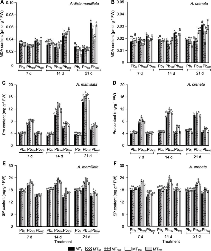 Figure 2 Effects of different concentrations of melatonin on the contents of malondialdehyde (MDA) (A, B), proline (Pro) (C, D) and soluble protein (SP) (E, F) in leaves of Ardisia mamillata and A. crenata under lead stress (A), (C), (E) Ardisia mamillata; (B), (D), (F) A. crenata. Pb0, Pb100, Pb600, MT0, MT50, MT100, MT150, and MT200 are the same as shown in Figure 1. Different lowercase letters indicate significant differences among the treatments during the same stage at 0.05 level.