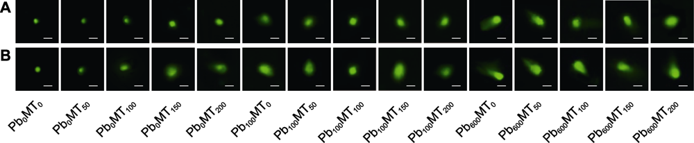 Figure 5 Effects of different concentrations of melatonin on DNA damage in roots of Ardisia mamillata (A) and A. crenata (B) under lead stress Bars=20 μm
