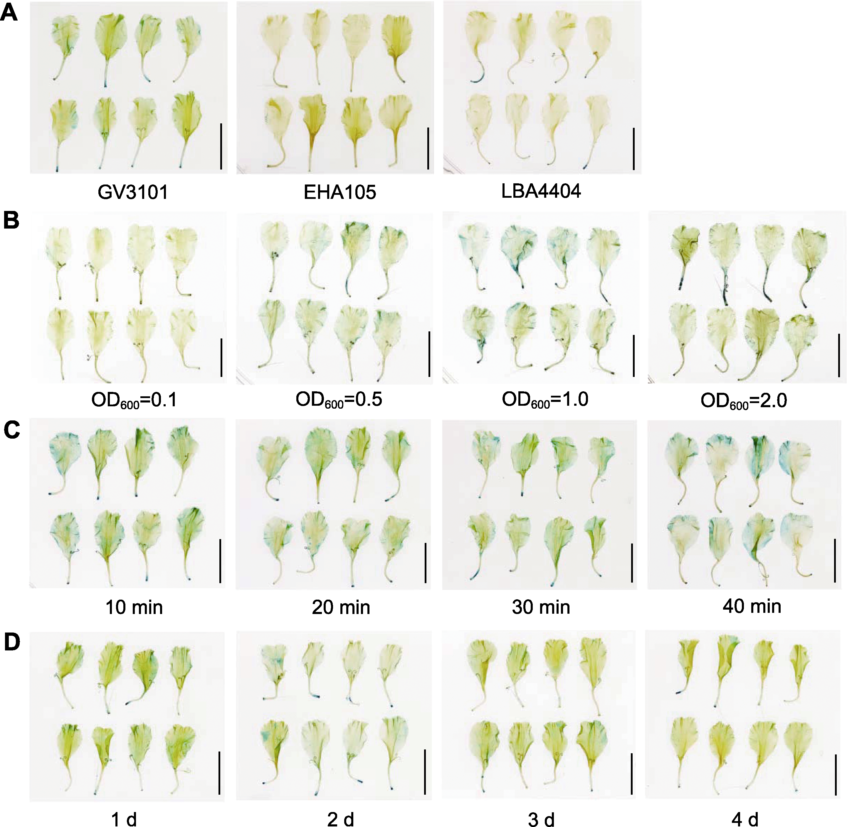 Figure 1 GUS staining of marigold (Tagetes erecta) corollas under different transient transformation conditions (A) GUS staining of marigold corollas infected by three different bacterial strains; (B) GUS staining under four different concentrations (OD600) of bacterial suspension; (C) GUS staining under four different infection duration; (D) GUS staining under four different co-culture time. (A)-(D) Bars=1 cm