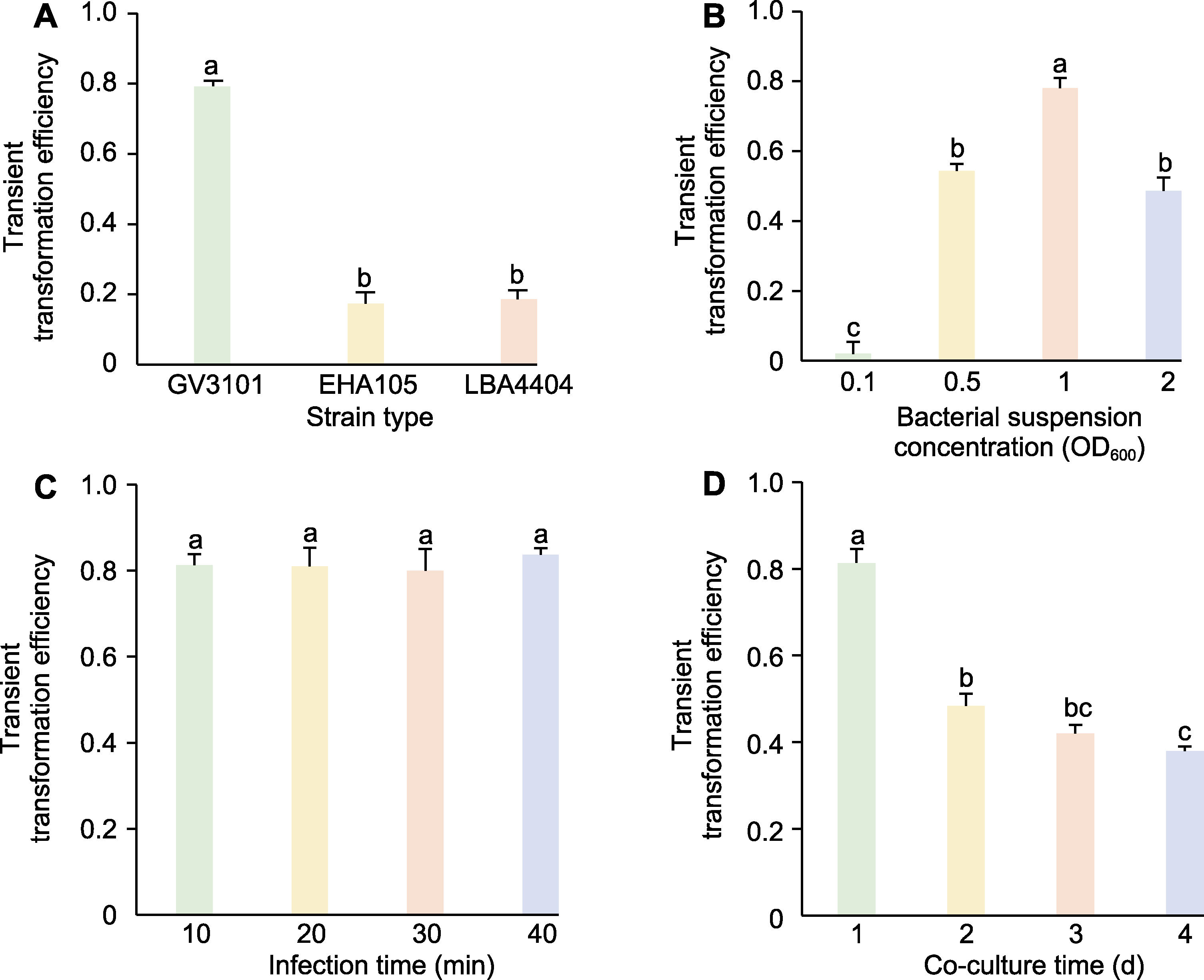 Figure 2 The influence of strain type (A), bacterial suspension concentration (B), infection time (C), and co-culture time (D) on the transient transformation efficiency of Tagetes erecta corollas Different lowercase letters on the histogram indicate significant differences at the P<0.05 level.