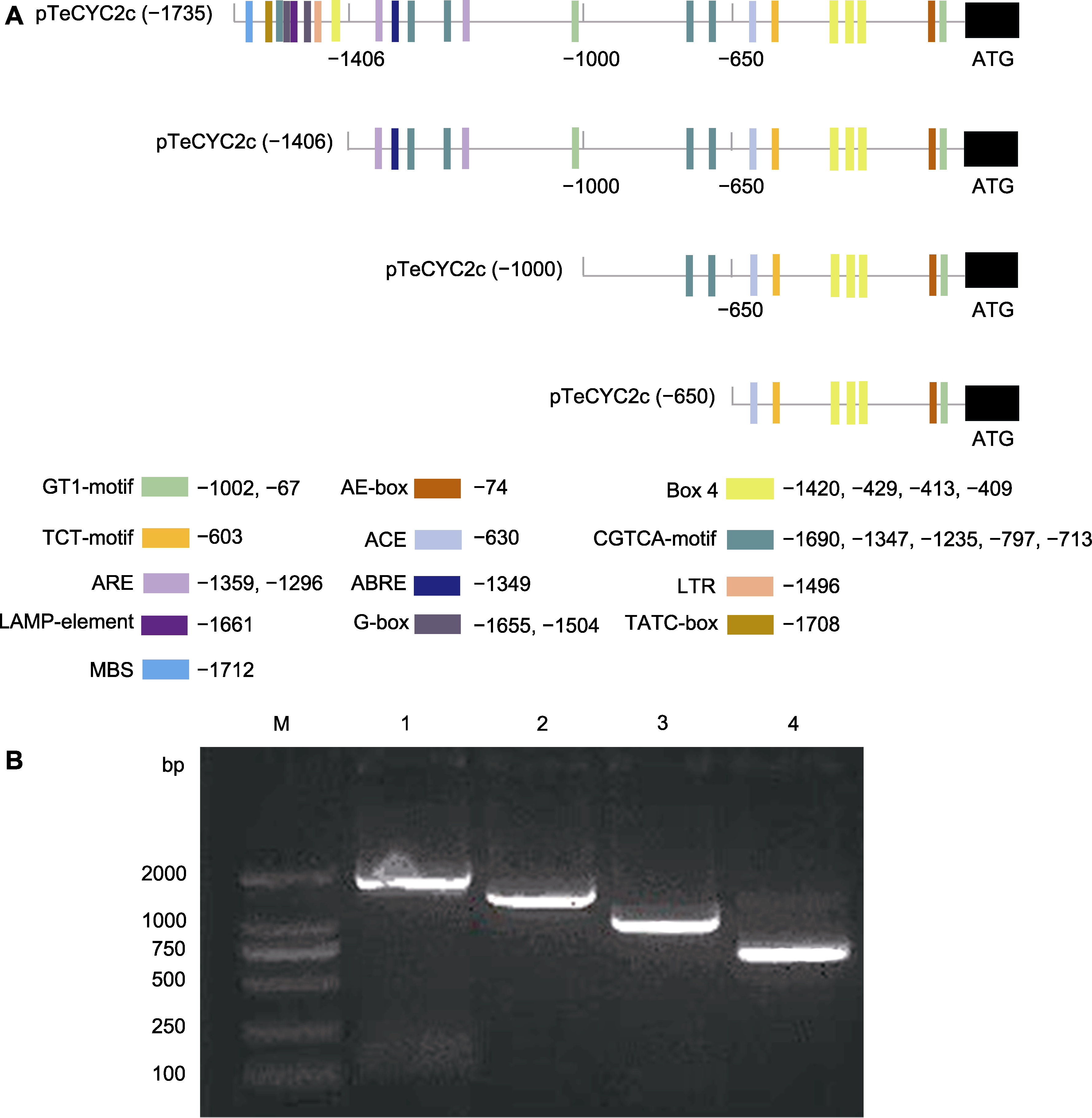 Figure 3 Schematic diagram of the design of TeCYC2c gene promoter deletion fragments and cloning of different length fragments of the promoter (A) Schematic diagram of the design of TeCYC2c gene promoter deletion fragments (Box 4: Light-responsive element; ACE: Light-responsive element; TCT-motif: Light-responsive element; GT1-motif: Light-responsive element; AE-box: Light-responsive element; ARE: Anaerobic induction element; MBS: Drought induction element; CGTCA-motif: MeJA-responsive element; ABRE: ABA-responsive element; TATC-box: GA-responsive element; LTR: Low-temperature responsive element; the numerical values in the figure are in bp); (B) Cloning of different length fragments of the TeCYC2c gene promoter (M: DL2000 marker; 1-4: Representing pTeCYC2c (-1 735), pTeCYC2c (-1 406), pTeCYC2c (-1 000), and pTeCYC2c (-650), respectively).