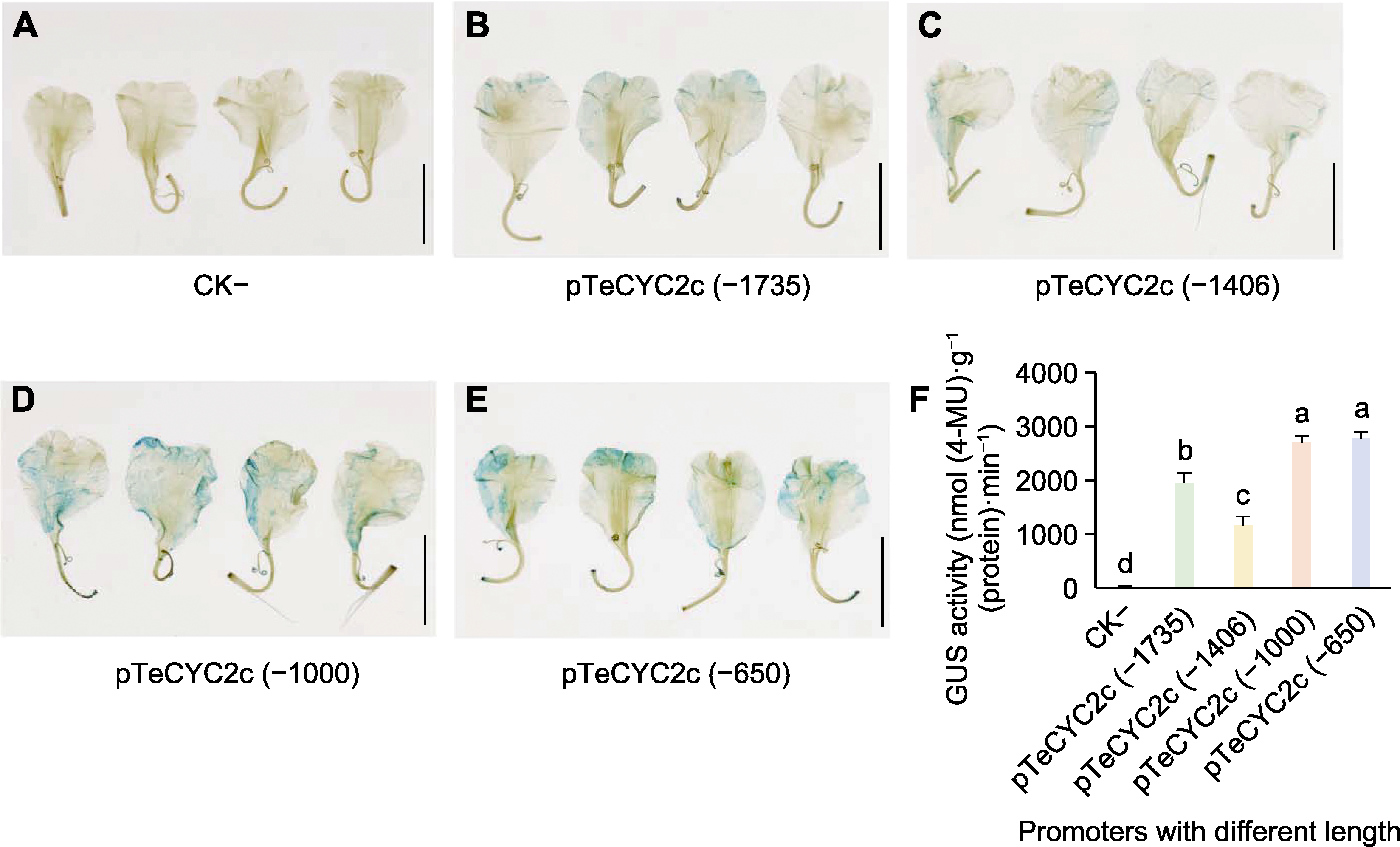 Figure 4 GUS staining and GUS activity assay driven by the promoters with different lengths (A) Negative control; (B) GUS staining under the influence of pTeCYC2c (-1 735); (C) GUS staining under the influence of pTeCYC2c (-1 406); (D) GUS staining under the influence of pTeCYC2c (-1 000); (E) GUS staining under the influence of pTeCYC2c (-650); (F) Determination of GUS activity driven by the promoters with different length. Different lowercase letters on the bar graph indicate significant differences at the P<0.05 level. (A)-(E) Bars=1 cm