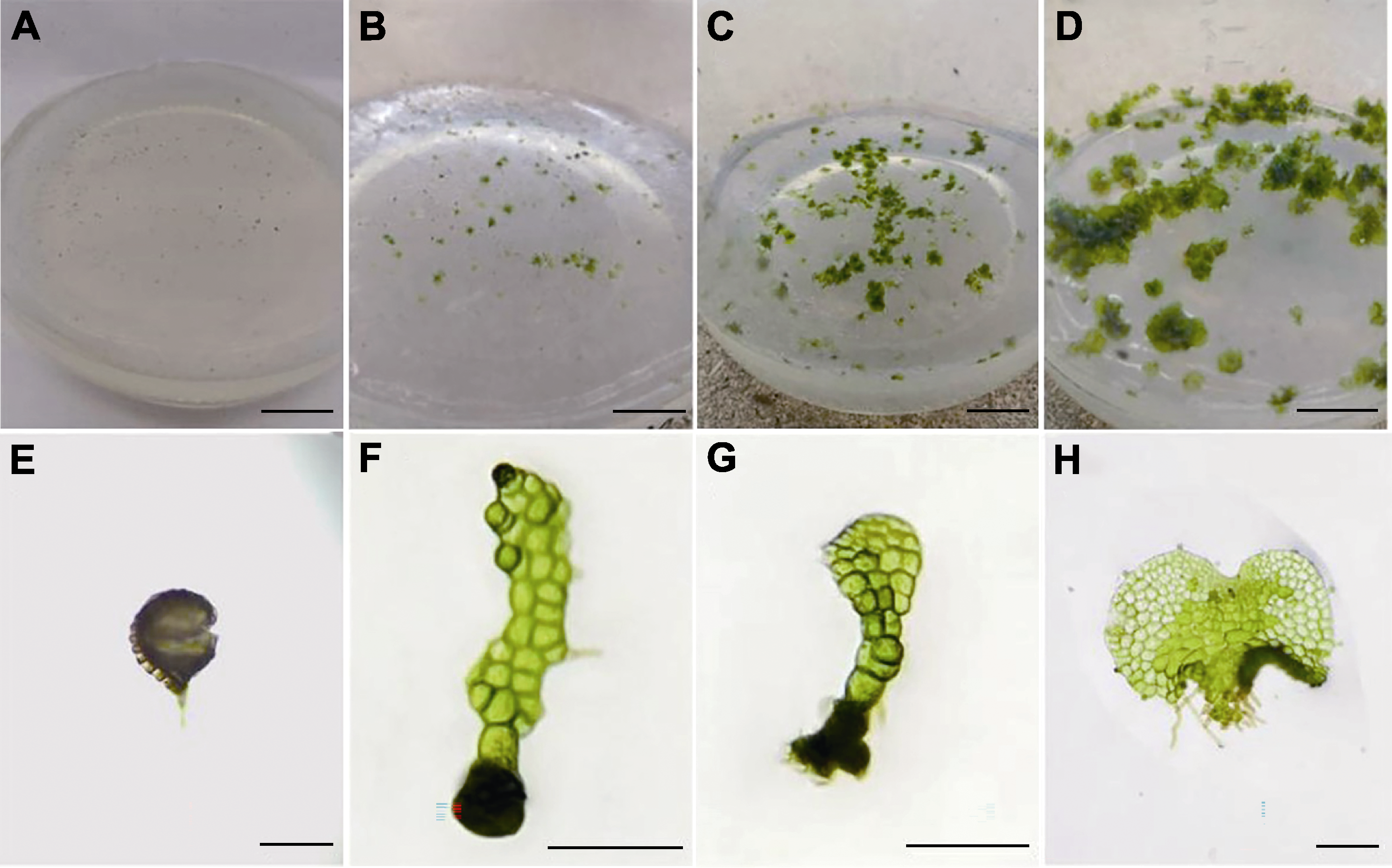 Figure 1 Spore germination process (A) Establishment of aseptic system (20 days) (bar=2 cm); (B) Germination of fertile spores (30 days) (bar=2 cm); (C) Prothallus (45 days) (bar=2 cm); (D) Prothallus (70 days) (bar=2 cm); (E) Spore germination (bar=50 μm); (F) Filamentous period (bar=100 μm); (G) Early lamellar period (bar=100 μm); (H) Cardioprothallus stage (bar=50 μm)