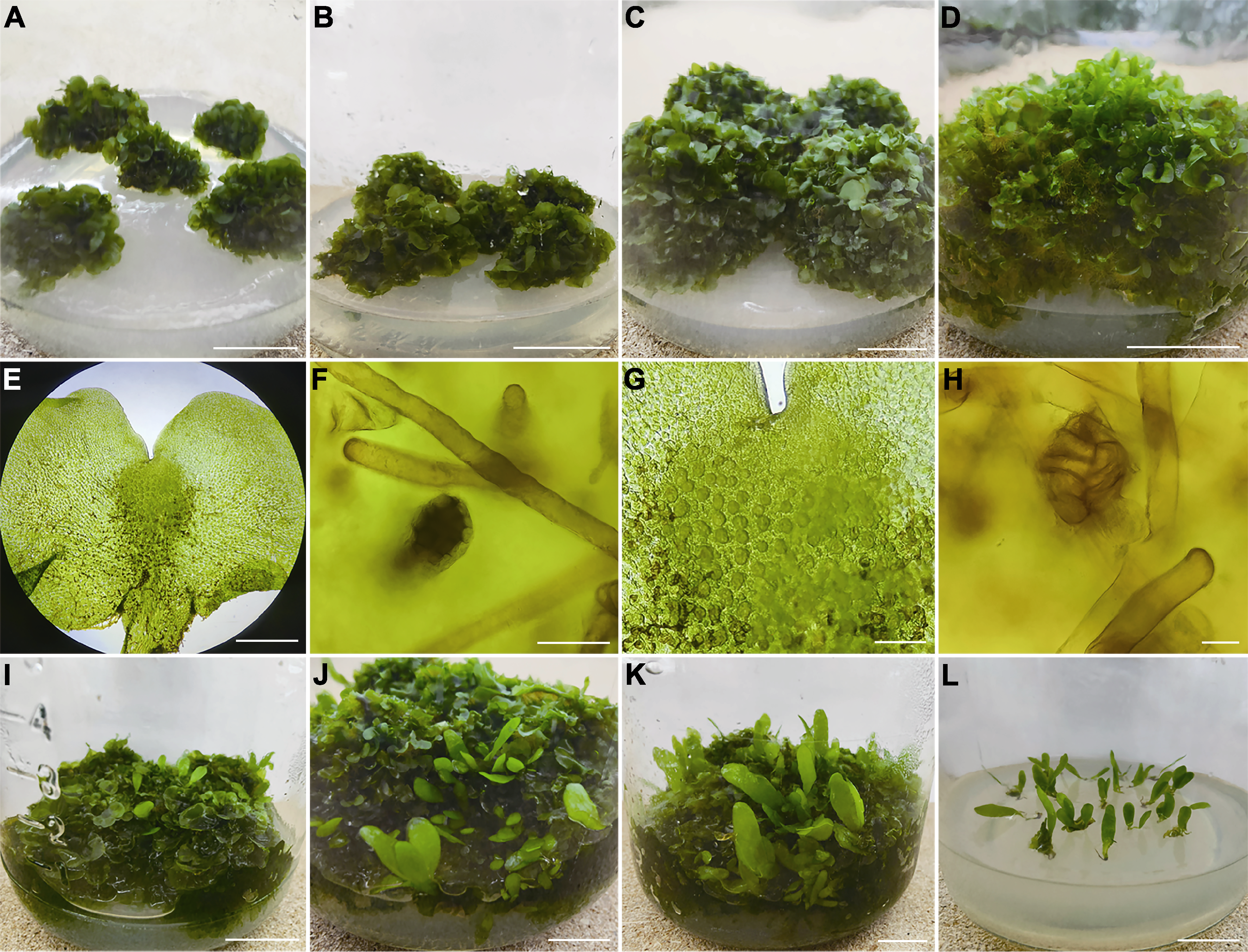 Figure 2 Proliferation of prothallus and induction of young sporophytes (A) Prolobular mass was transferred after 15 days (bar=2 cm); (B) Prolobular mass was transferred after 30 days (bar=2 cm); (C) Prolobular mass was transferred after 45 days (bar=2 cm); (D) Prolobular mass was transferred after 60 days (bar=2 cm); (E) Gametophyte (bar=500 μm); (F) Antheridium (bar=40 μm); (G) Local archegonium (bar=200 μm); (H) Archegonium (bar=40 μm); (I) Prothallus and young sporophyte cultured with water after 20 days (bar=2 cm); (J) Prothallus and young sporophyte cultured with water after 60 days (bar=2 cm); (K) Prothallus and young sporophyte cultured with water after 90 days (bar=2 cm); (L) Sporophyte rooting culture (bar=2 cm)