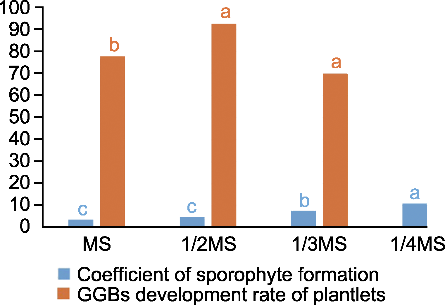 Figure 3 Effects of different inorganic salt concentrations on sporophyte induction and plantlet rate of green globular bodies (GGBs) development Different lowercase letters indicate significant differences at the 0.05 level.