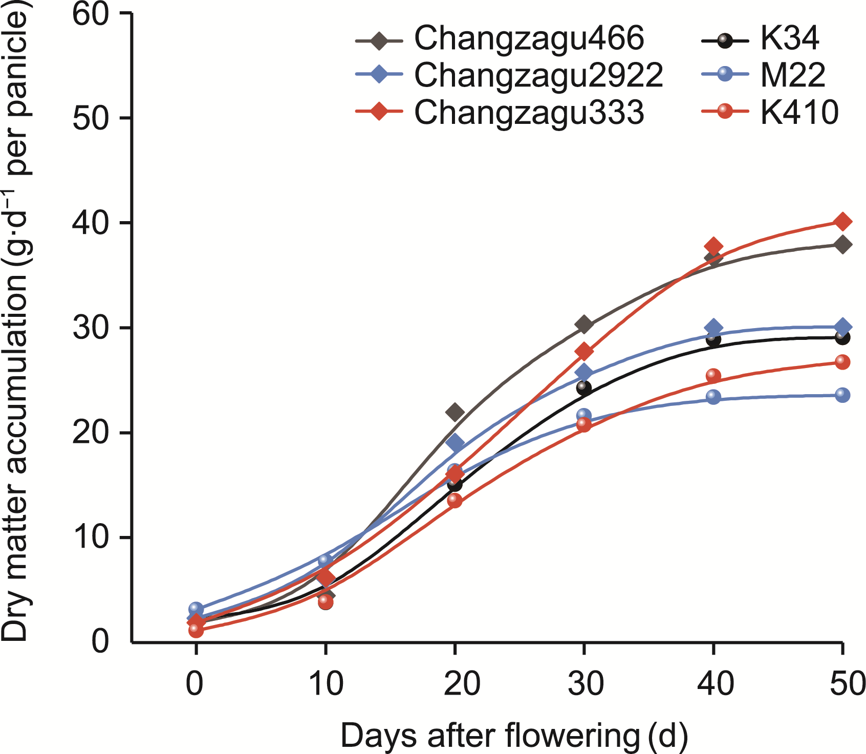 | Variety | Dry matter accumulation (g∙d-1 per panicle) | Over-parent heterosis (%) | ||||