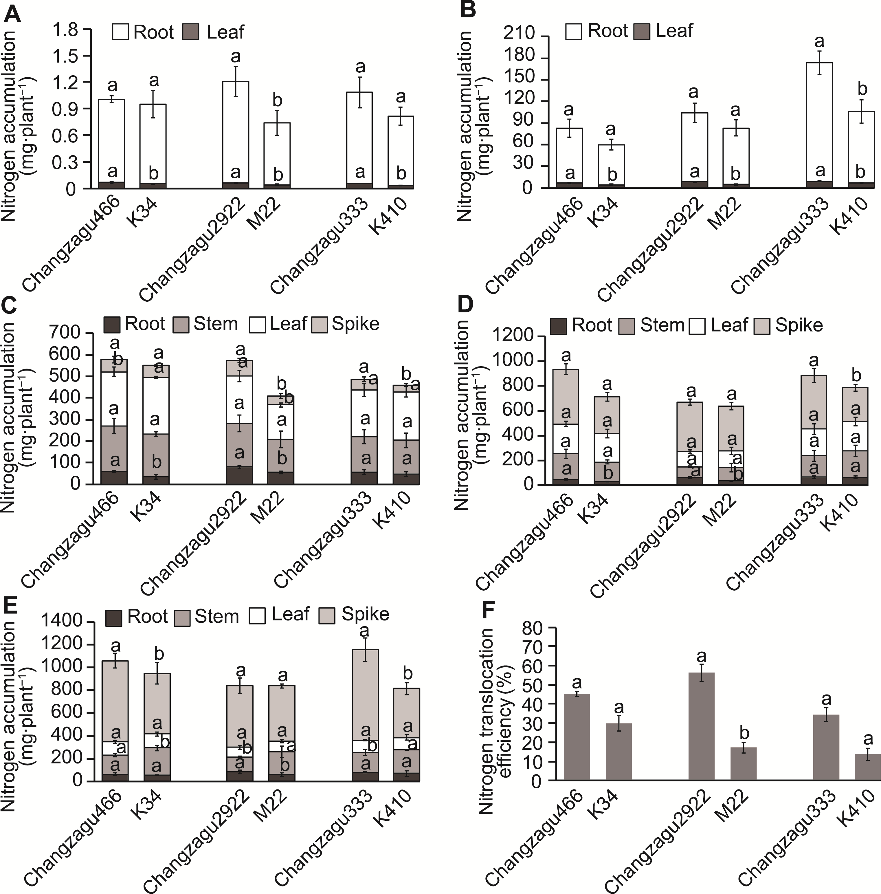 Figure 5 Nitrogen accumulation and nitrogen translocation efficiency in different organs of millet at different growth stages (A) Nitrogen accumulation at seedling stage; (B) Nitrogen accumulation at jointing stage; (C) Nitrogen accumulation at full heading stage; (D) Nitrogen accumulation at grouting stage; (E) Nitrogen accumulation at maturity stage; (F) Nitrogen transport efficiency. Different lowercase letters indicate significant differences at the 0.05 level.