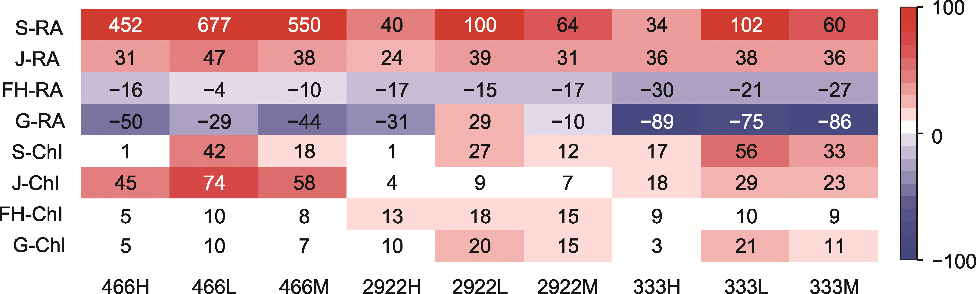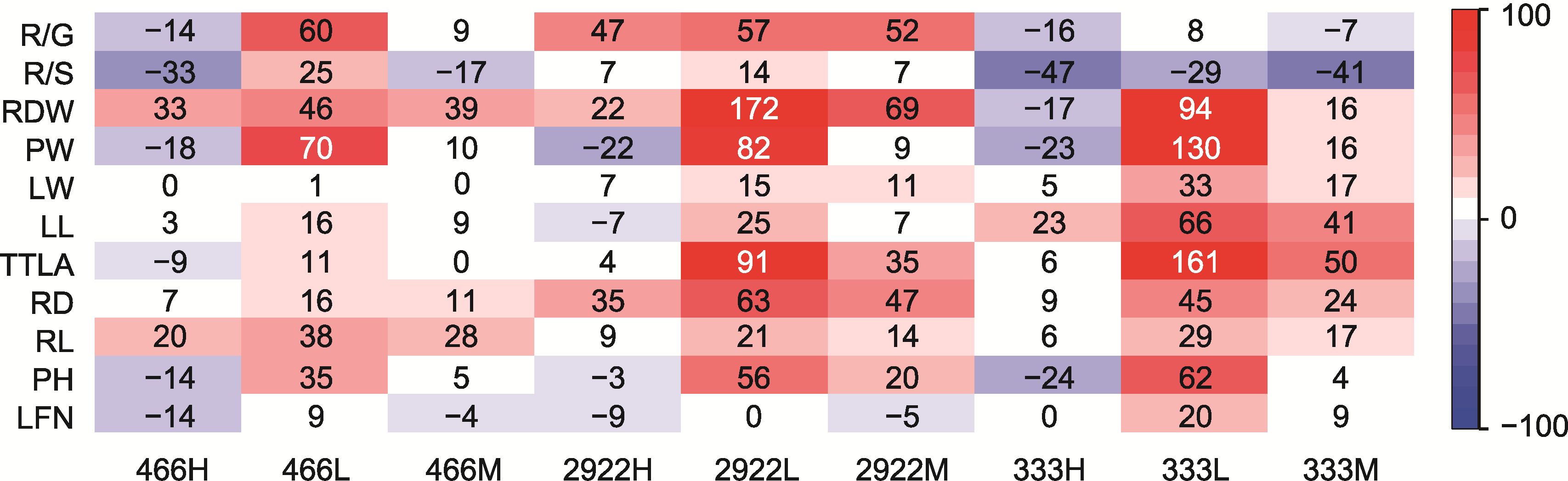 Figure 3 Heterosis in physiological index of millet RA: Root activity; Chl: Chlorophyll content; S: Seedling stage; J: Jointing stage; FH: Full heading stage; G: Grouting stage; H: Over-parent advantage; L: Low-parent advantage; M: Medium-parent advantage. The scale color indicates the dominance range (-100-100); red represents the positive dominance level and blue represents the negative dominance level, and the dominance color beyond the range is indicated by the deepest color.