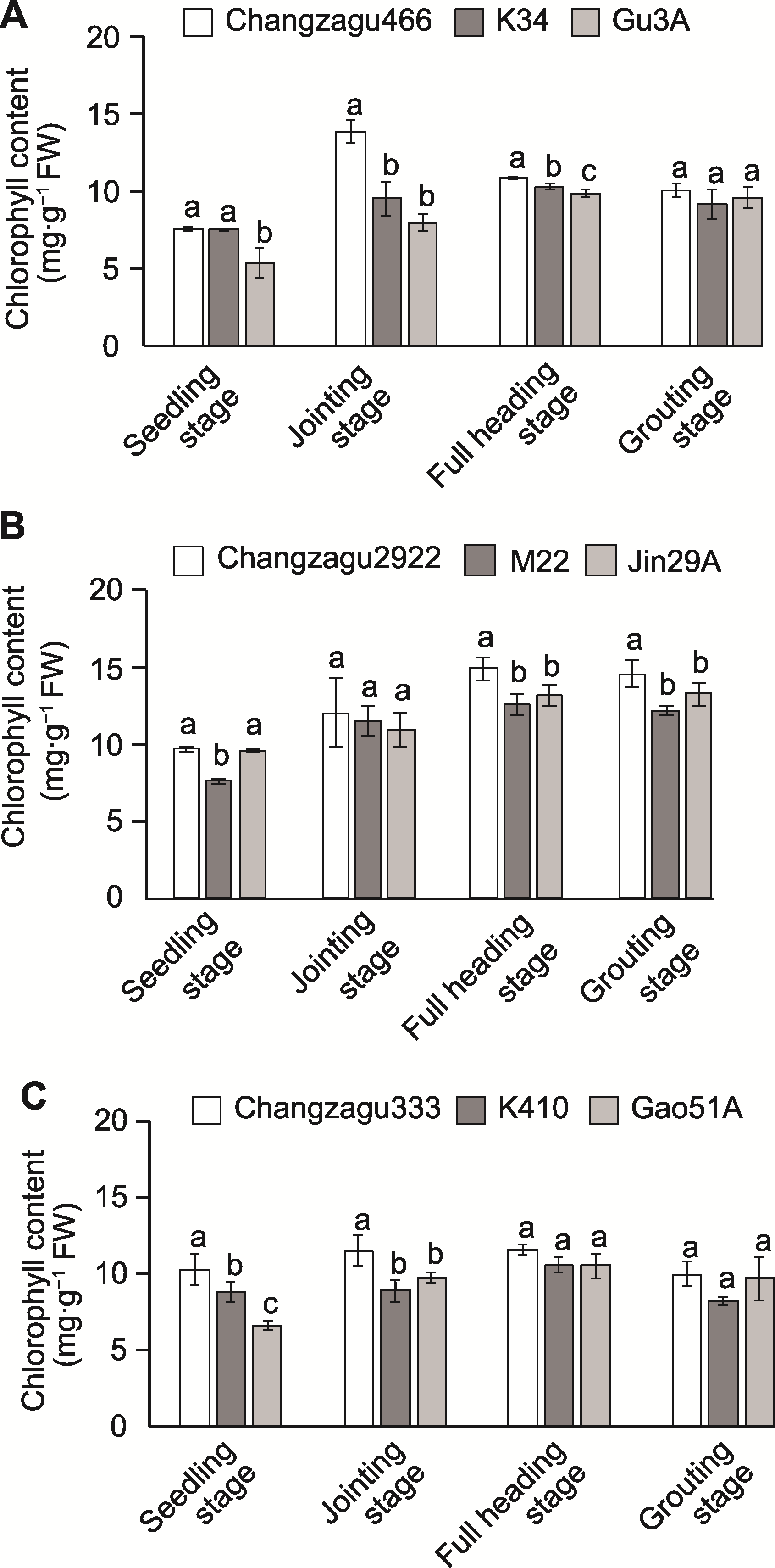 Figure 1 Chlorophyll content of millet at different growth stages The materials Changzagu466, its paternal parent is K34 and its maternal parent is Gu3A; Changzagu2922, its paternal parent is M22 and its maternal parent is Jin29A; Changzagu333, its paternal parent is K410 and its maternal parent is Gao51A. Different lowercase letters indicate significant differences at the 0.05 level.