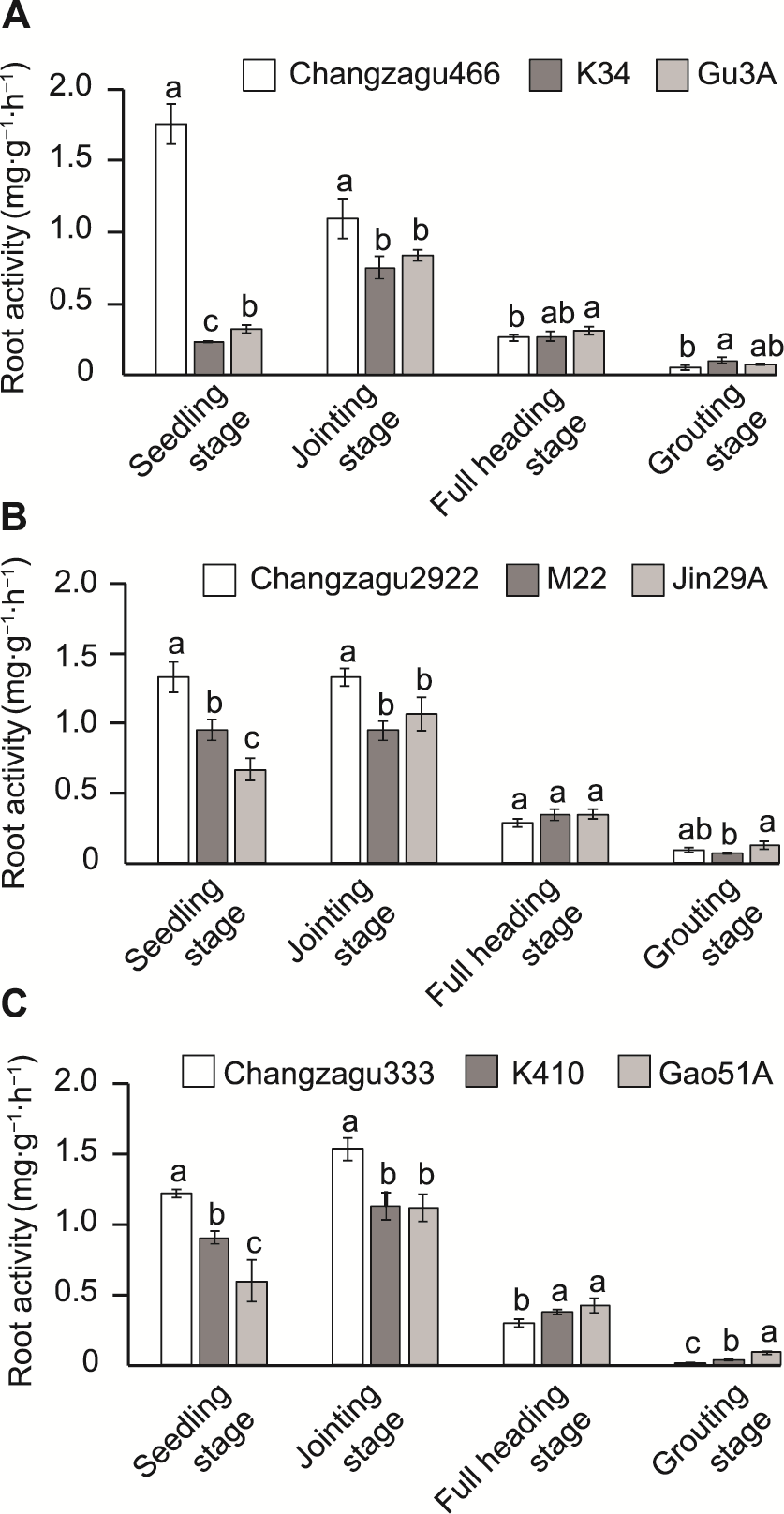 Figure 2 Root activity of millet at different growth stages The materials are the same as shown in Figure 1. Different lowercase letters indicate significant differences at the 0.05 level.