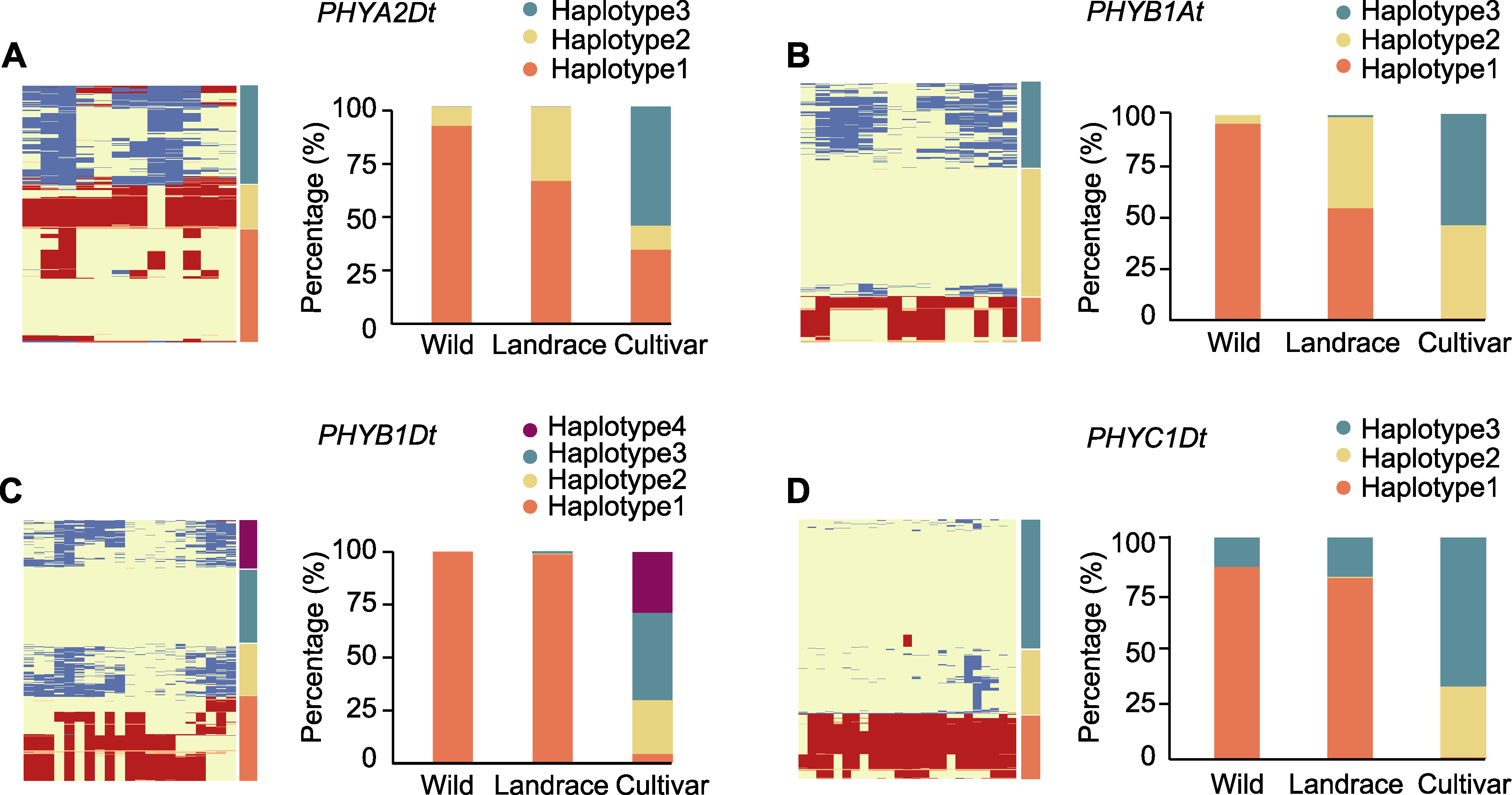 Figure 6 Haplotype analysis of PHY genes in wild, landrace and cultivar The left figure represents the clustering of different materials, and the right figure represents the proportion of different haplotypes in wild, landrace and cultivar.