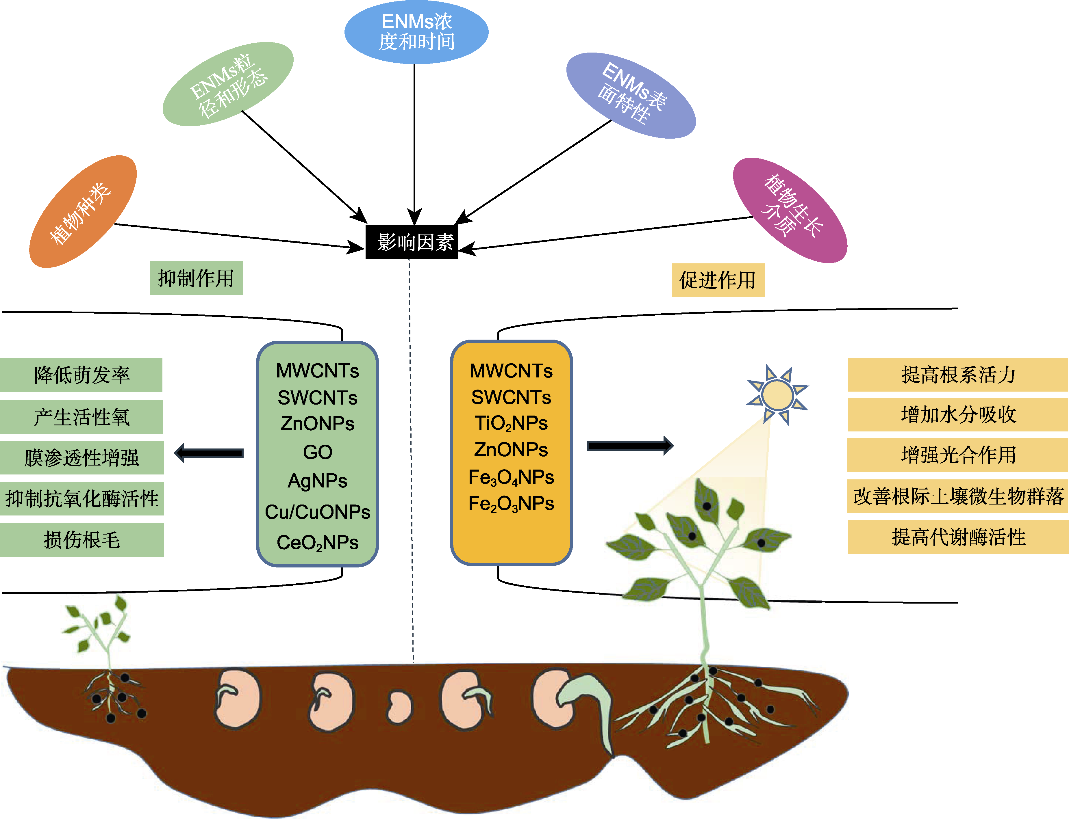 | Figure 2 Biological effects, influencing factors and interaction mechanisms of engineered nanomaterials in plants ENMs: Engineered nanomaterials; MWCNTs: Multi-wall carbon nanotubes; SWCNTs: Single-wall carbon nanotubes; ZnONPs: Zinc oxide nanoparticles; GO: Graphene oxide; AgNPs: Ag nanoparticles; Cu/CuONPs: Copper-based nanoparticles; CeO2NPs: Cesium dioxide nanoparticles; TiO2NPs: Titanium dioxide nanoparticles; Fe3O4NPs: Iron oxide nanoparticles; Fe2O3NPs: Iron-based nanoparticles |