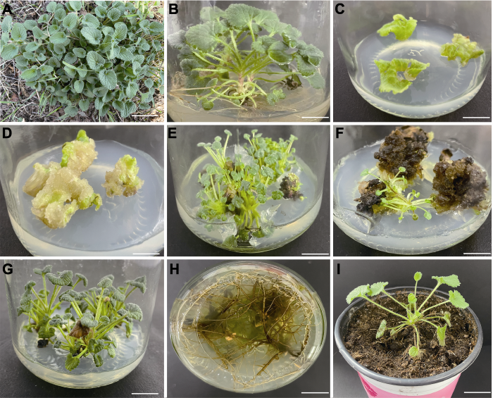 (A) 大田叶片; (B) 组培苗; (C) 叶片膨大; (D) 愈伤组织诱导; (E) 大田叶片愈伤组织分化不定芽; (F) 组培苗叶片愈伤组织分化不定芽; (G) 不定芽增殖; (H) 根系状态; (I) 移栽。Bars=2 cm