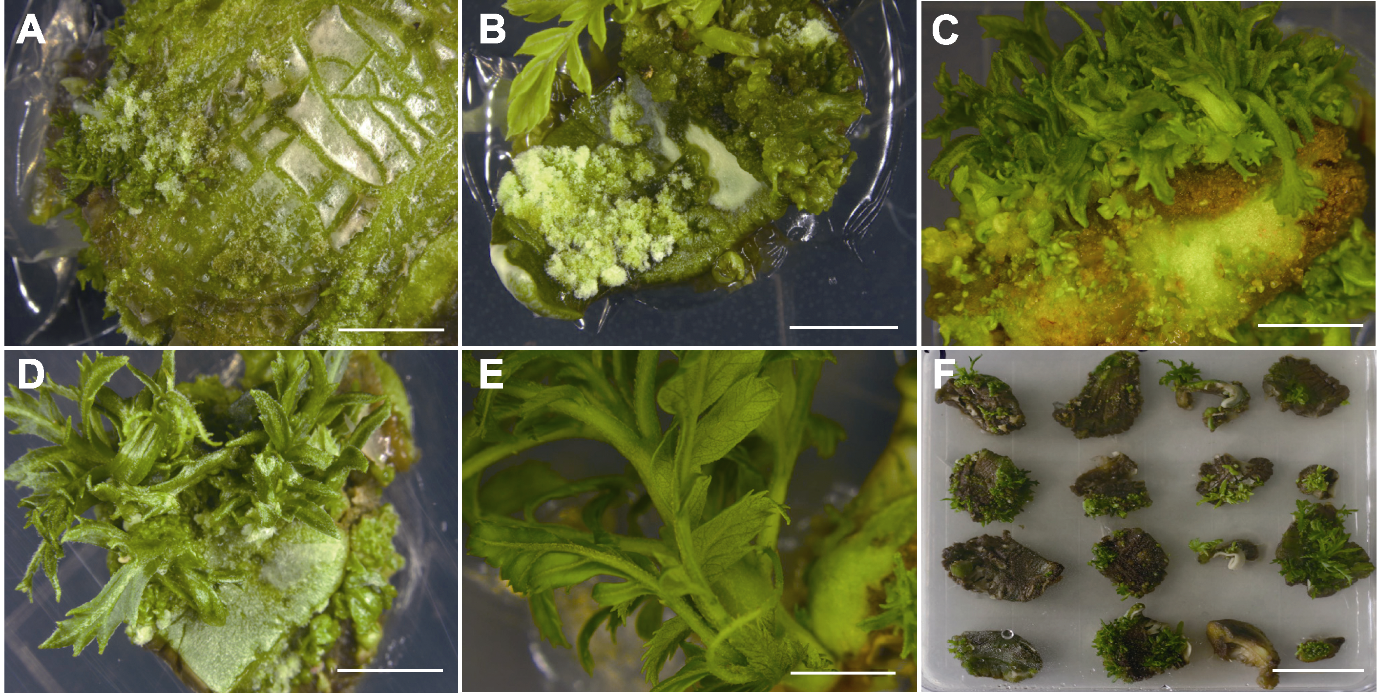 | 图1 不同植物生长调节剂处理诱导文冠果不定芽生长 (A)-(E) 种仁接入培养基后6、15、21、28及35天的生长情况(bars=5 mm); (F) 种仁接入培养基后21天的褐化情况(bar=2 cm) |